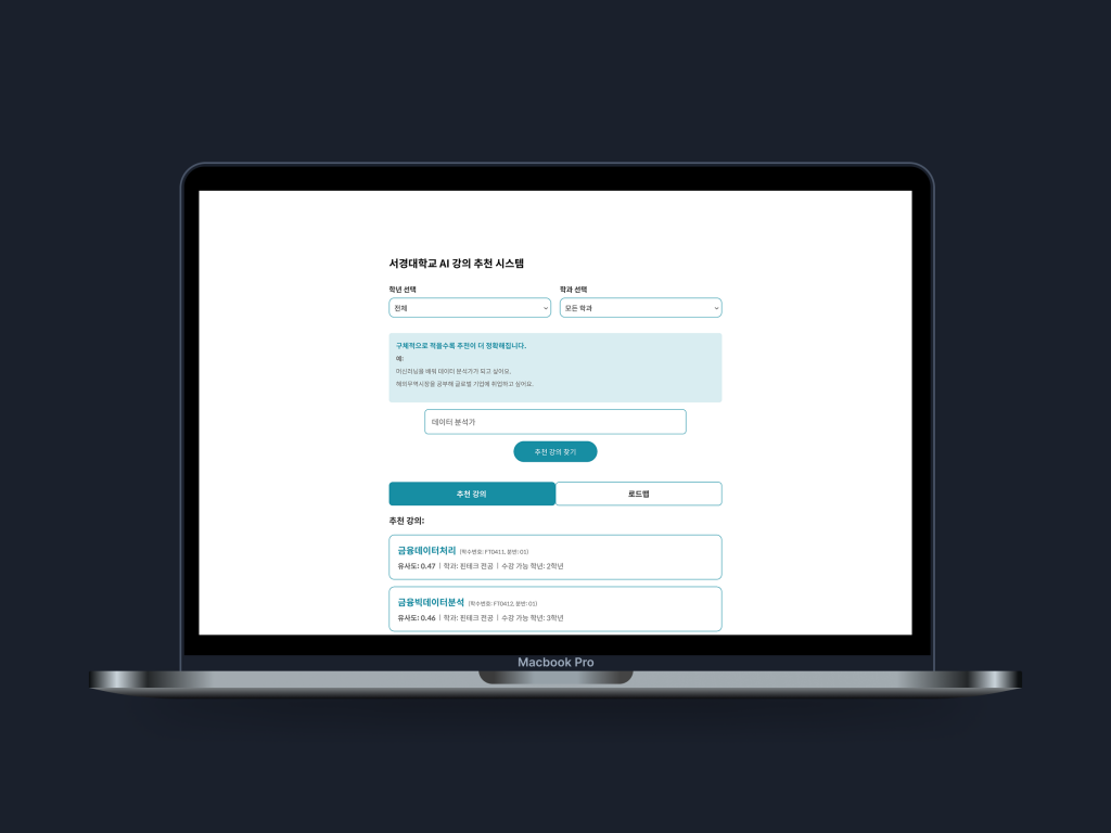- A대학교의 실제 강의 및 학생 데이터(개인 정보 비식별화)를 통해 지능형 강의 추천 서비스 구현